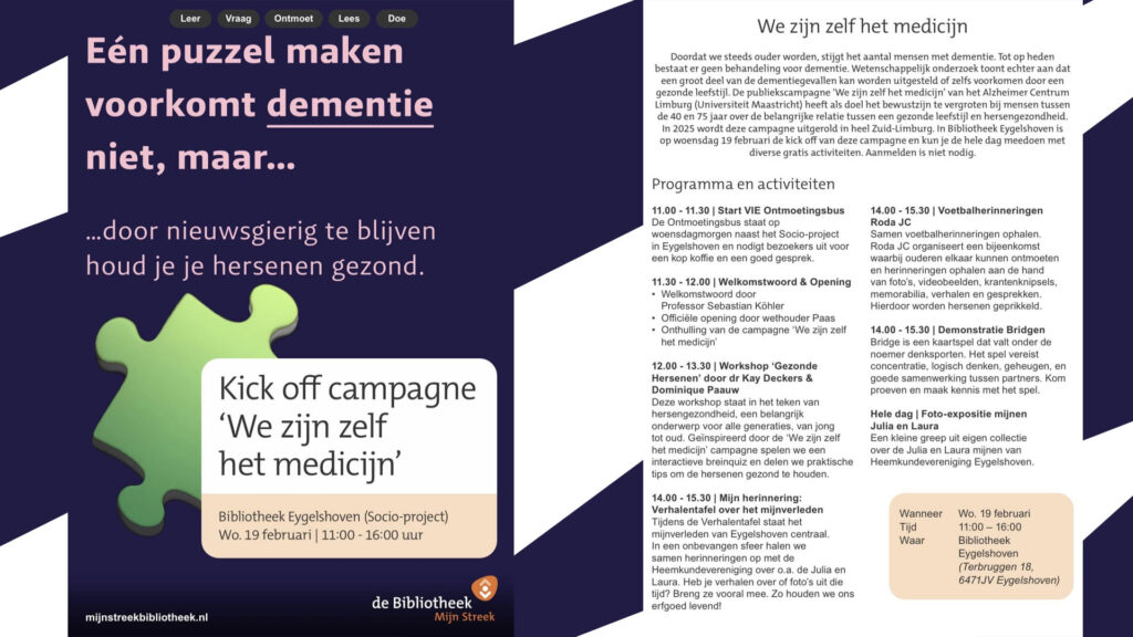 15 februari 2025Start campagne ‘We zijn zelf het medicijn’ met focus op een gezonde leefstijl ter preventie van dementie