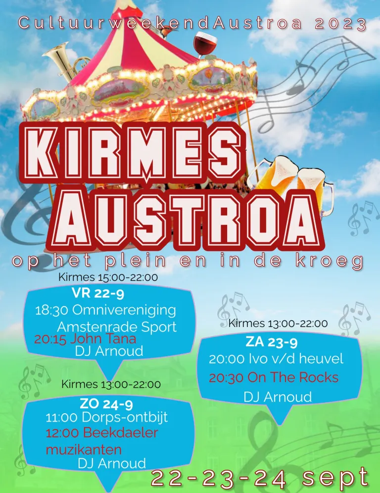 Na een periode van afwezigheid is er op het weekend van 22, 23 en 24 september opnieuw een kermis te beleven in Amstenrade. De verenigingen van Amstenrade hebben zich verenigd om het 'Cultuurweekend Austroa' te organiseren, waarbij naast de kermis op het Raadhuisplein, er ook een gevarieerd cultureel randprogramma voor alle leeftijden is. Dit biedt een platform voor verschillende lokale verenigingen om zich te presenteren, er wordt gedanst en het hele weekend staat in het teken van ontmoeting.