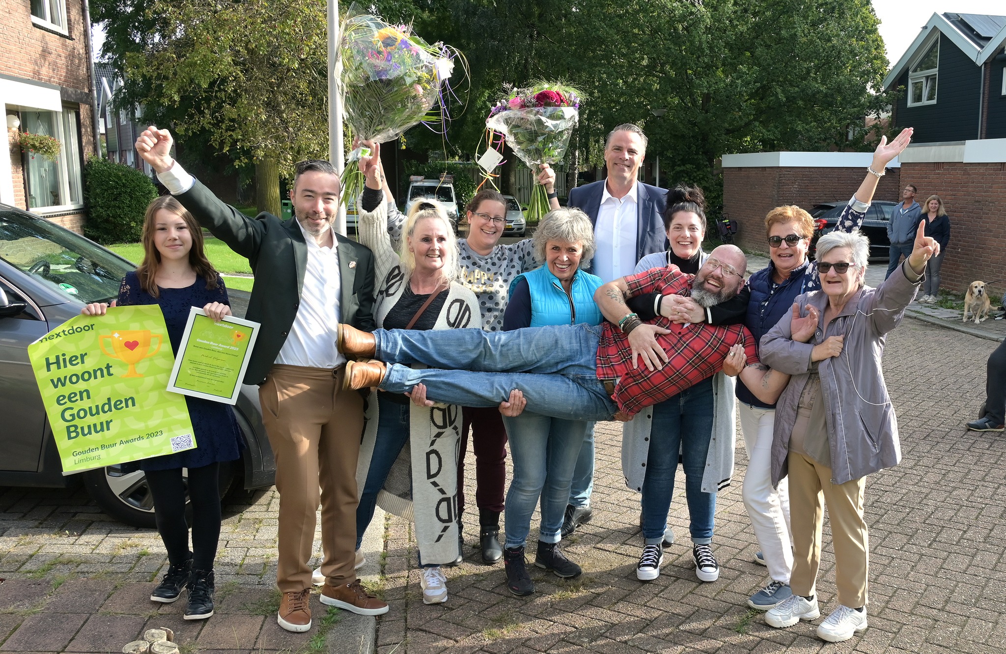 Marianne: “Mijn stoere overbuurman Michael is altijd bereid om anderen te helpen, ondanks zijn drukke fulltime baan en jonge gezin. Vorig jaar, toen ik mijn enkel brak in de herfst, nam hij maandenlang de tijd om mijn twee honden dagelijks uit te laten. In de winter houdt hij de stoepen schoon voor onze oudere buren en recentelijk, bij wateroverlast, ging hij de deuren langs om te checken of iedereen veilig was. Michael heeft liefde en respect voor alles wat leeft, en staat altijd open voor een goed gesprek, advies of hulp bij klusjes, zonder opdringerig te zijn. Hij is de beste buurman ooit.” Wethouder Alexanders Geers vult aan: “Een ludieke manier om Michael te bedanken, ik heb van de buren begrepen dat hij steeds in weer is voor anderen. Deze award is dan ook dik verdiend!”