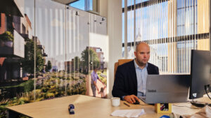 Wethouder kijkt uit naar de nieuwe centrumontwikkelingen, hier zichtbaar op de concepttekeningen achter hem. Foto: Jan Danihel | © RTV Parkstad